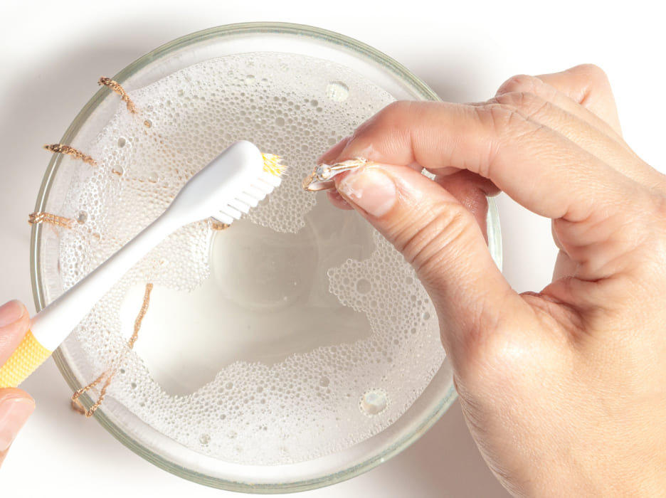 Cleaning your diamonds is simple with a soft-bristled toothbrush and warm water. This method helps reach between the prongs holding your diamond and gently removes any dirt or buildup from the stone.